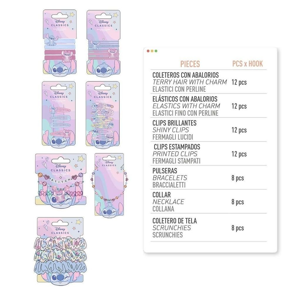 | presentoir-accessoires-disney-stitch | Barettes multicolores, Barettes 2 couleurs, Elastiques fins, Elastiques épais, Chouchous, Bracelets, Colliers |
