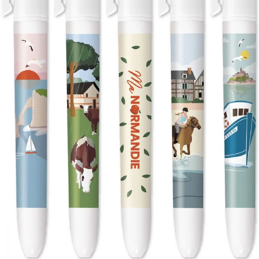 Direction la Normandie avec cette collection de cinq stylos vous invitant à explorer la richesse culturelle et naturelle de cette région emblématique. Retrouvez notamment les Falaises d’Étretat, la campagne et ses vaches normandes, les vergers de pommiers symbolisés par les feuilles de pommiers autour de « Ma Normandie », les bords de mer et la baie du Mont Saint-Michel. Une collection clin d’œil qui ravira les amoureux de cette région de son esthétique et authenticité normande !