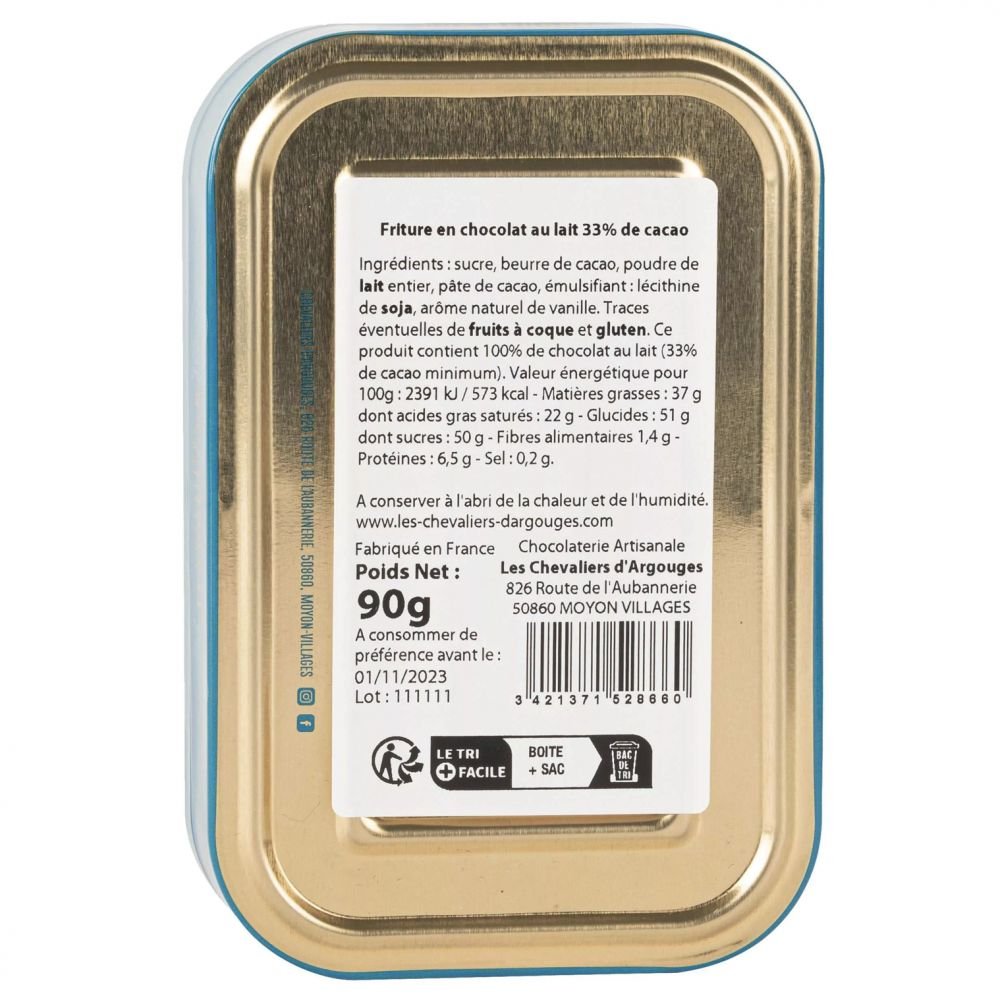 Fondez de plaisir pour nos fritures chocolat au lait 33% de cacao le tout présenté dans une élégante boite sardines de Pâques 90g.
