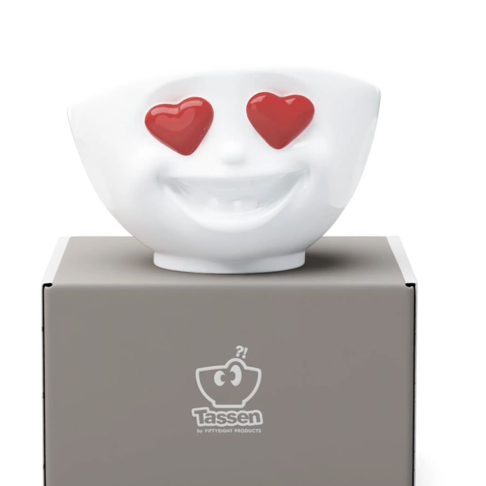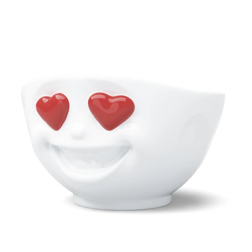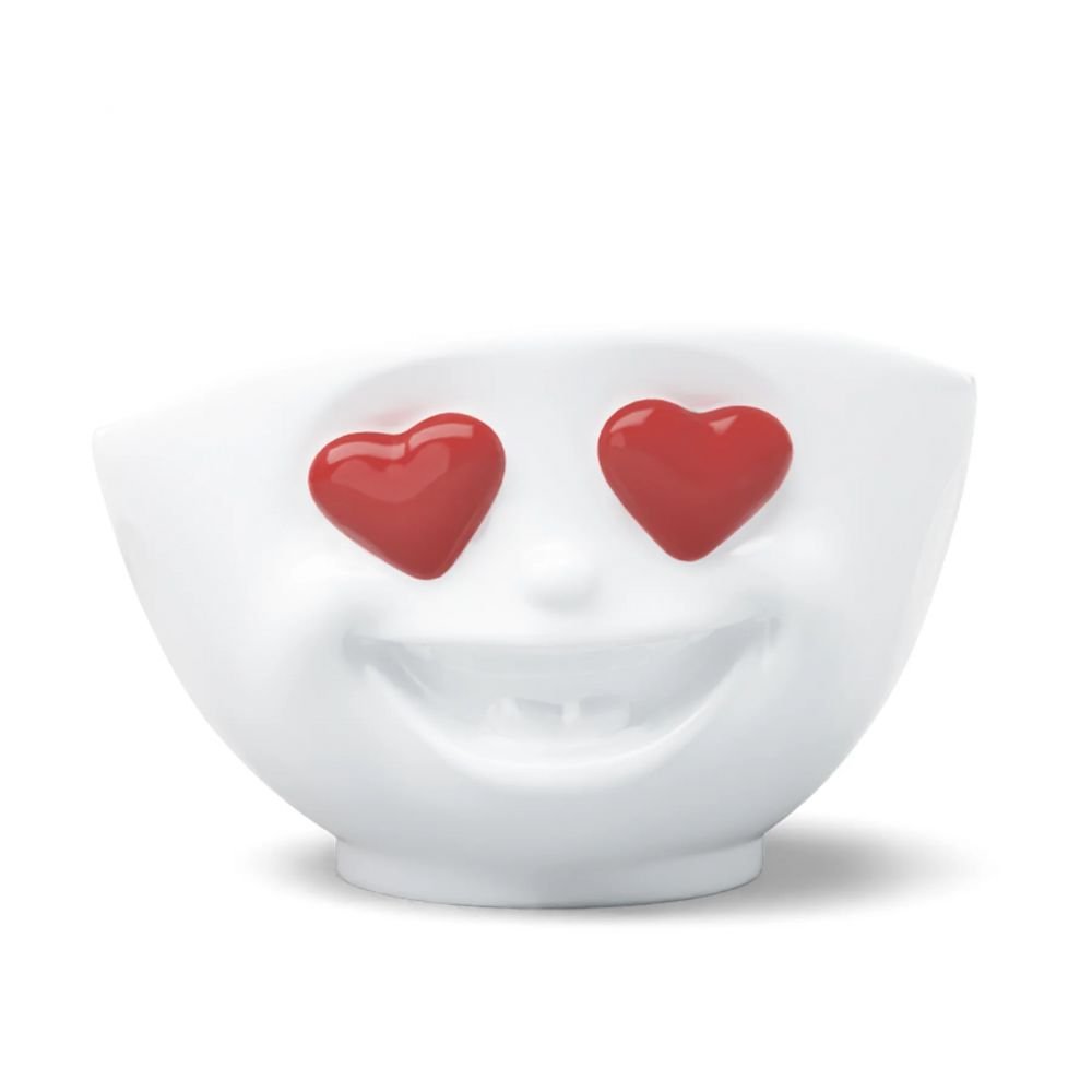 Ce bol en porcelaine blanche de qualité supérieure, fabriqué avec amour en Allmagne, arbore un visage expressif sculpté à même la matière, yeux cœurs rouges laqués, sourire irrésistible en relief. Une pièce qui attire l'œil avant même d'être remplie.