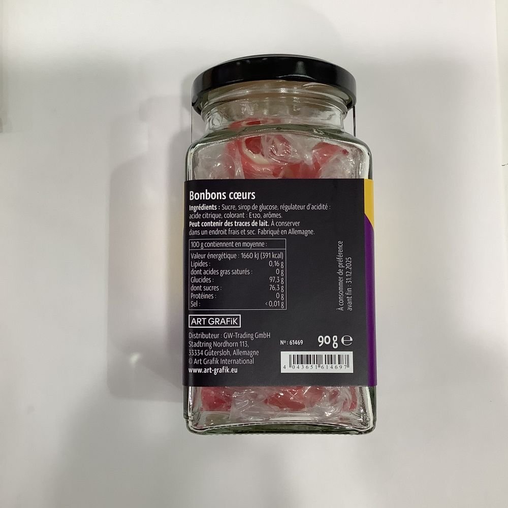Ingrédients :rnsucre, sirop de glucose, régulateur d’acidité, acide citrique, arômes, colorant naturel : E120. Peut contenir des traces de lait. A conserver dans un endroit frais et sec.rnFabrique en Allemagnernrn100 g en contiennent en moyenne :rnÉnergie : 1660 kJ (391 kcal)rnmatières grasses : 0,16 grndont acides gras saturés : 0 grnLes glucides : 97.3 grndont sucre : 76,3 grnProtéines : 0 grnle sel : < 0,01 g