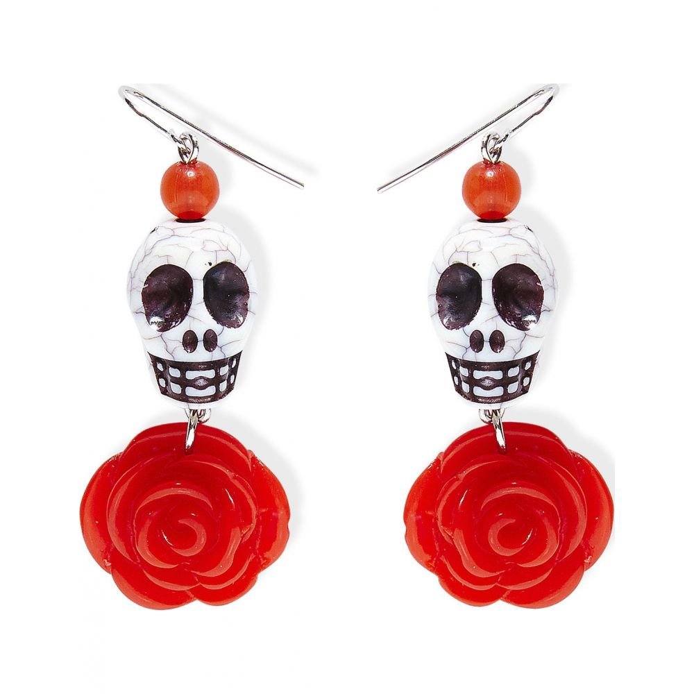 Ces boucles d’oreilles pour adulte représentent des crânes en plastique entouré de perles et de roses rouges en plastique.
