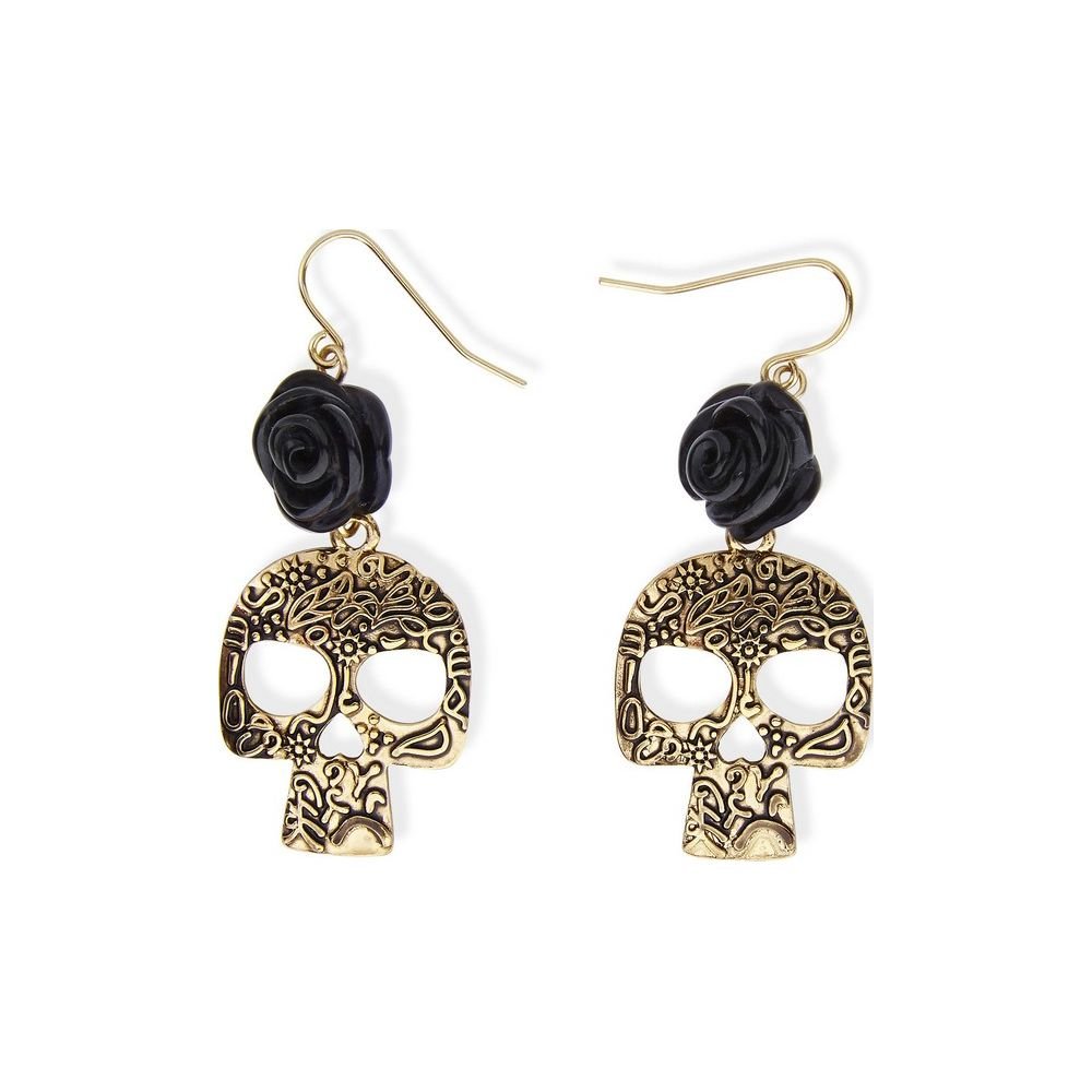 Ces boucles d’oreilles métalliques pour adulte représentent des crânes façon calaveras, surmontés d’une rose en plastique noir.