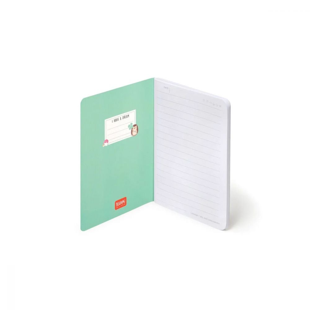 Cahier ligné sur le thème du Hérisson et Fermeture par Élastique. Dimensions 9,5 x 13,5 cm. 80 Pages en Papier Épais (100 g / m²) et Certifié FSC®