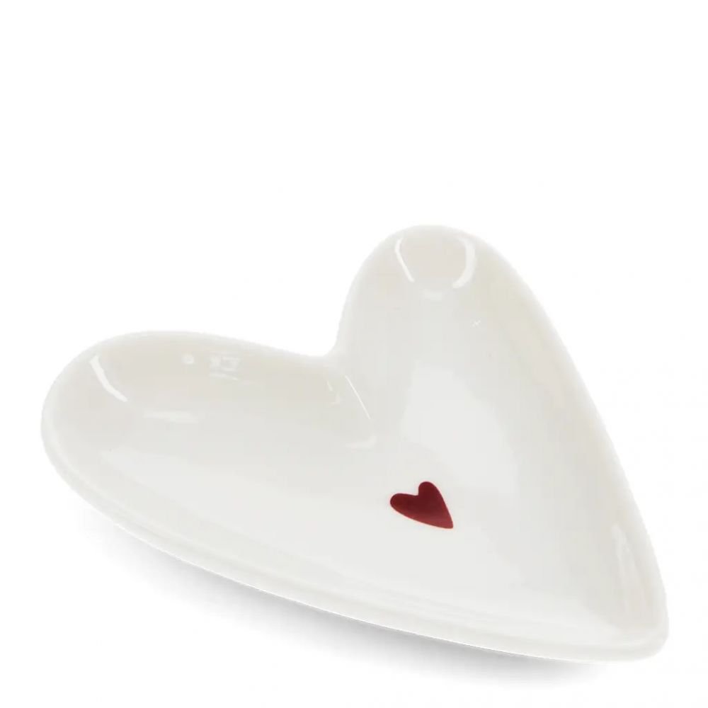 Petit vide-poche en céramique, en forme de cœur irrégulier. Avec sa finition blanche brillante et son simple motif de cœur rouge foncé au centre, il complète parfaitement les coiffeuses ou les tables de couloir. L'endroit idéal pour déposer de petits bijoux tels que des bagues et des boucles d'oreilles.