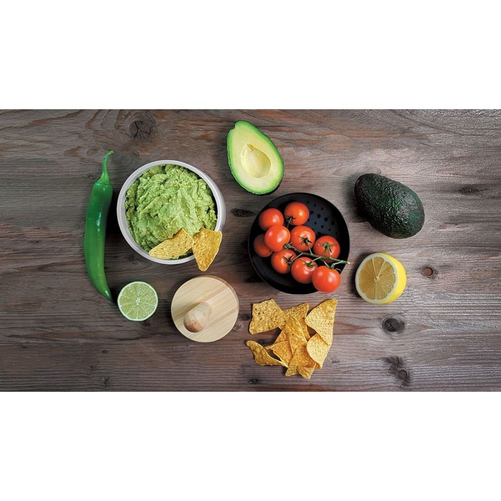 Retirez la grille et servez directement votre guacamole dans le bol en céramique blanc qui a permis de le préparer. C’est pratique et rapide !