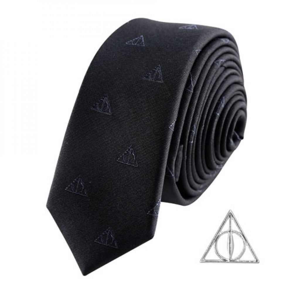Coffret cadeau contenant une cravate tissée avec un logo brodé et un pins. La cravate des Reliques de la Mort se distingue avec une coupe fine à la française, sur laquelle sont brodés les symboles des reliques de la mort.