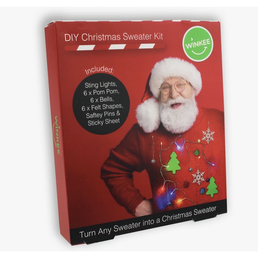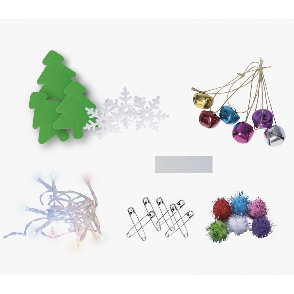 L’ensemble comprend des guirlandes LED à piles, des pompons, divers autocollants en polaire, des cloches et d’autres accessoires
