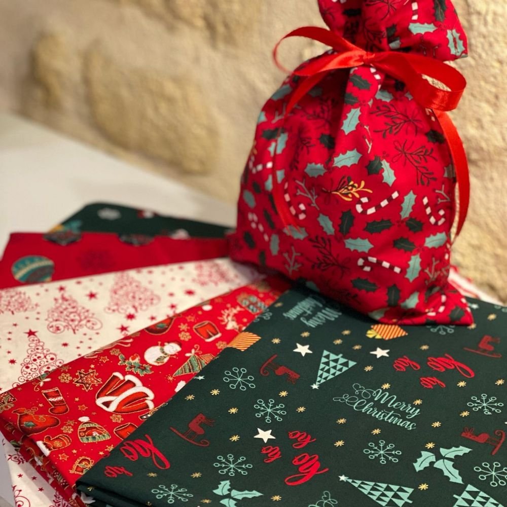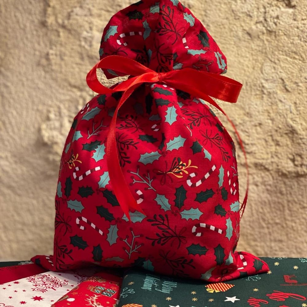 Pochon cadeau réutilisable avec noeud en tissu. Différents motifs de Noël.