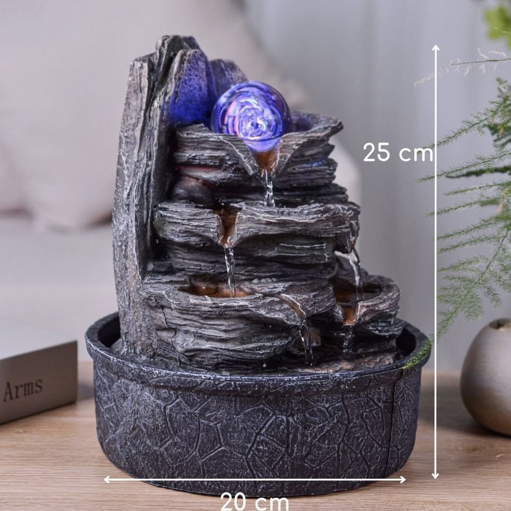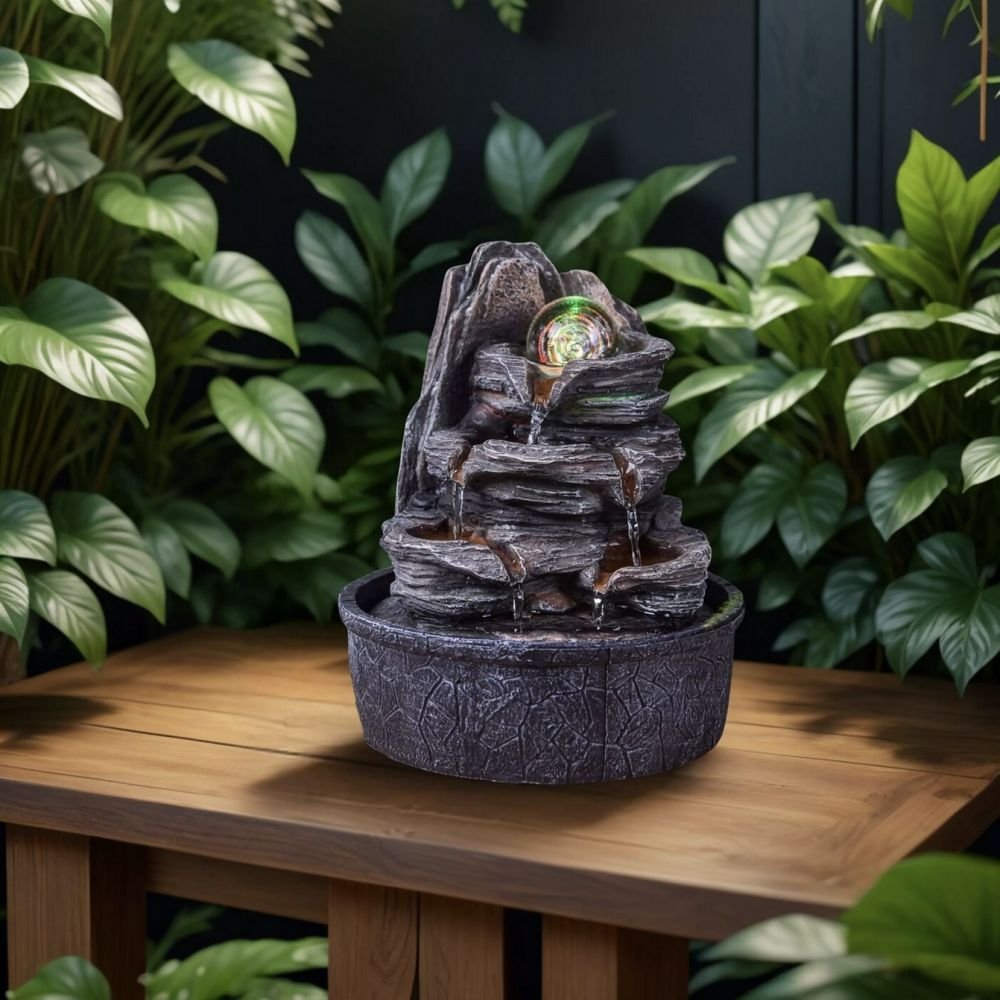 La fontaine Luberon se caractérise par un écoulement d’eau fuyant à travers ce décor rocheux et entrainant sur son passage la boule de verre dans une rotation infinie. Un éclairage led est intégré avec une lumière colorée qui vient illuminer la boule de verre. Un travail de qualité a été réalisé sur la résine et sur la peinture pour lui donner cet aspect naturel et réaliste.