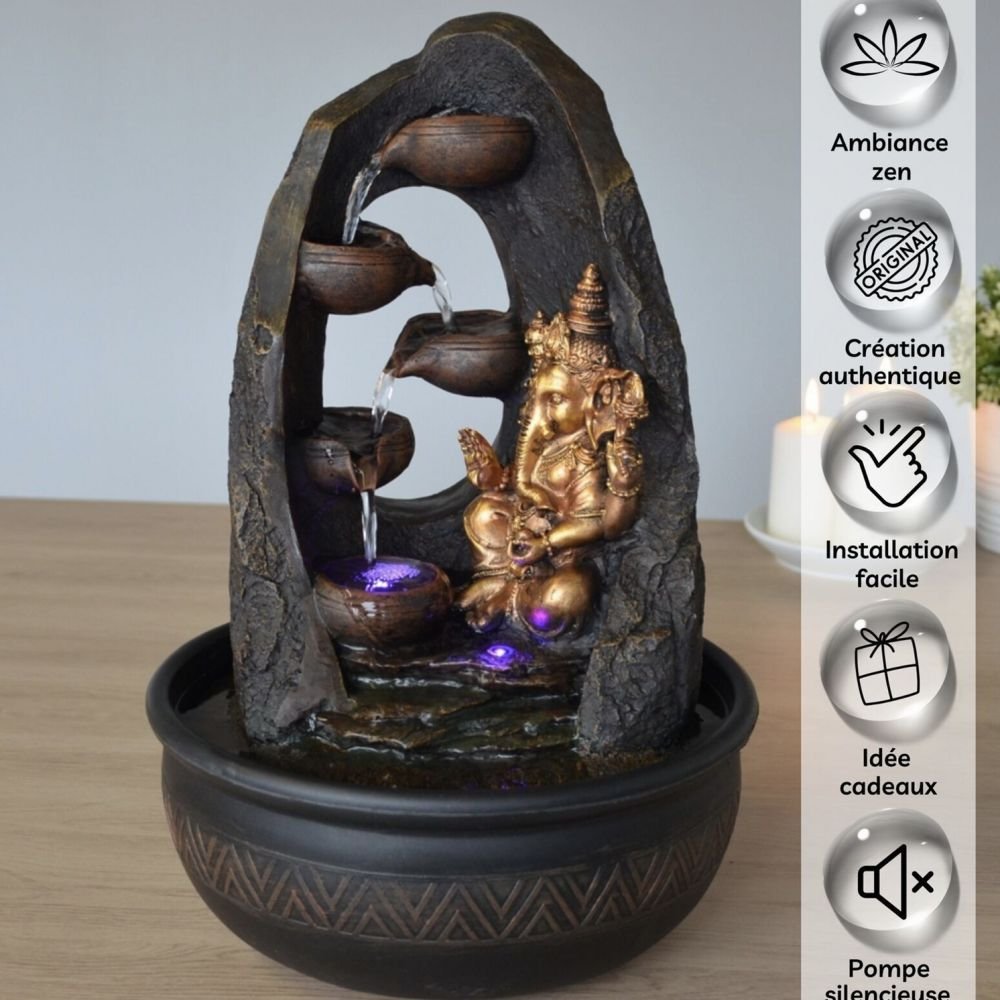 La fontaine Mystic se caractérise par la représentation de Ganesh, divinité indienne symbole de sagesse et de prospérité. L’eau descend le long du décor à côté de la statuette et vient s’écouler à l’avant de la fontaine. 2 éclairages led colorés viennent apporter de la luminosité. Un travail de qualité a été réalisé sur la résine et sur la peinture pour donner un aspect naturel et réaliste au décor rocheux.