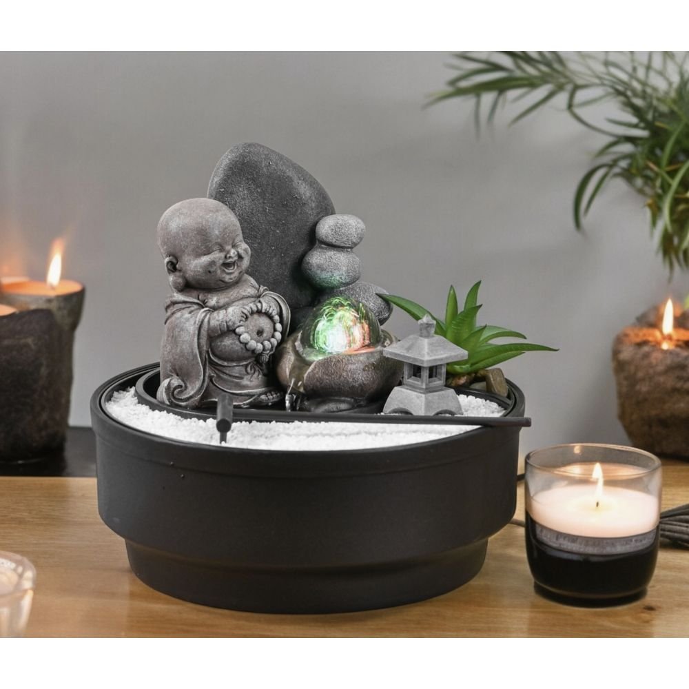 Contenu : Fontaine, pompe avec LED, sable, râteau, temple amovible, boule en verre, statuette bouddha.