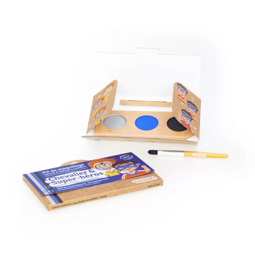 Transformez-vous en chevalier ou en super-héros avec ce kit de maquillage à l’eau certifié bio et hypoallergénique contenant une palette de 3 couleurs (argent, bleu, noir), 2 modèles de maquillage et 1 pinceau.