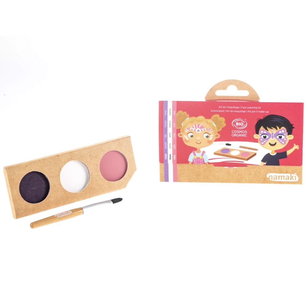 Devenez un ninja ou un super-héros avec ce kit de maquillage à l’eau certifié bio et hypoallergénique contenant une palette de 3 couleurs (rouge, or, noir), 2 modèles de maquillage et 1 pinceau.rnrnUne dizaine de maquillages peut être réalisée avec un kit : des heures de jeu en perspective !rnContenu du kit :rn1 palette cartonrn3 fards de couleur (3 x 2.5 g)rn1 pinceau cosmétiquern2 modèles de maquillage