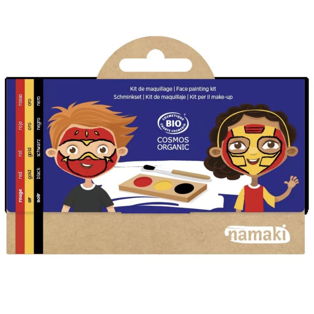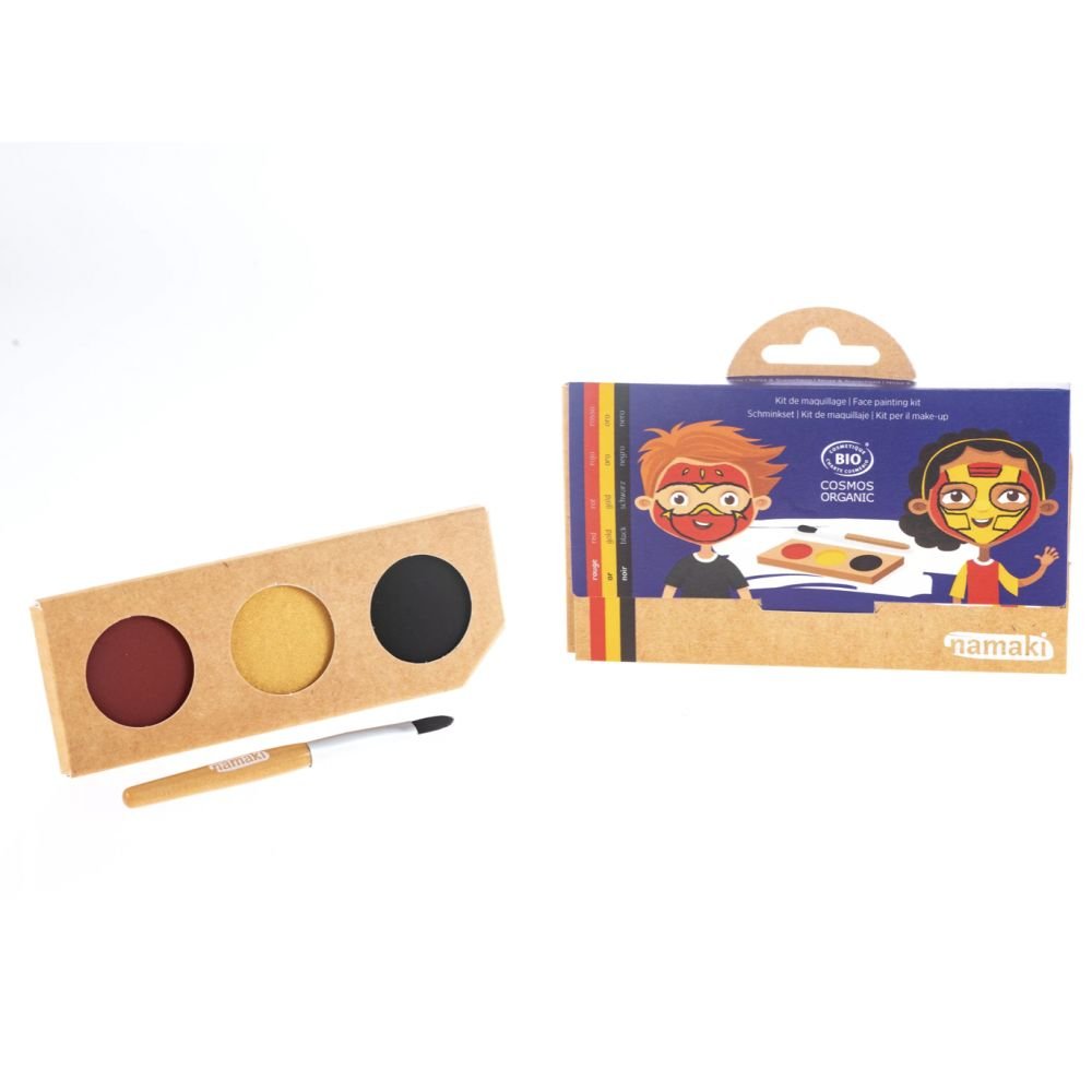 Devenez un ninja ou un super-héros avec ce kit de maquillage à l’eau certifié bio et hypoallergénique contenant une palette de 3 couleurs (rouge, or, noir), 2 modèles de maquillage et 1 pinceau.