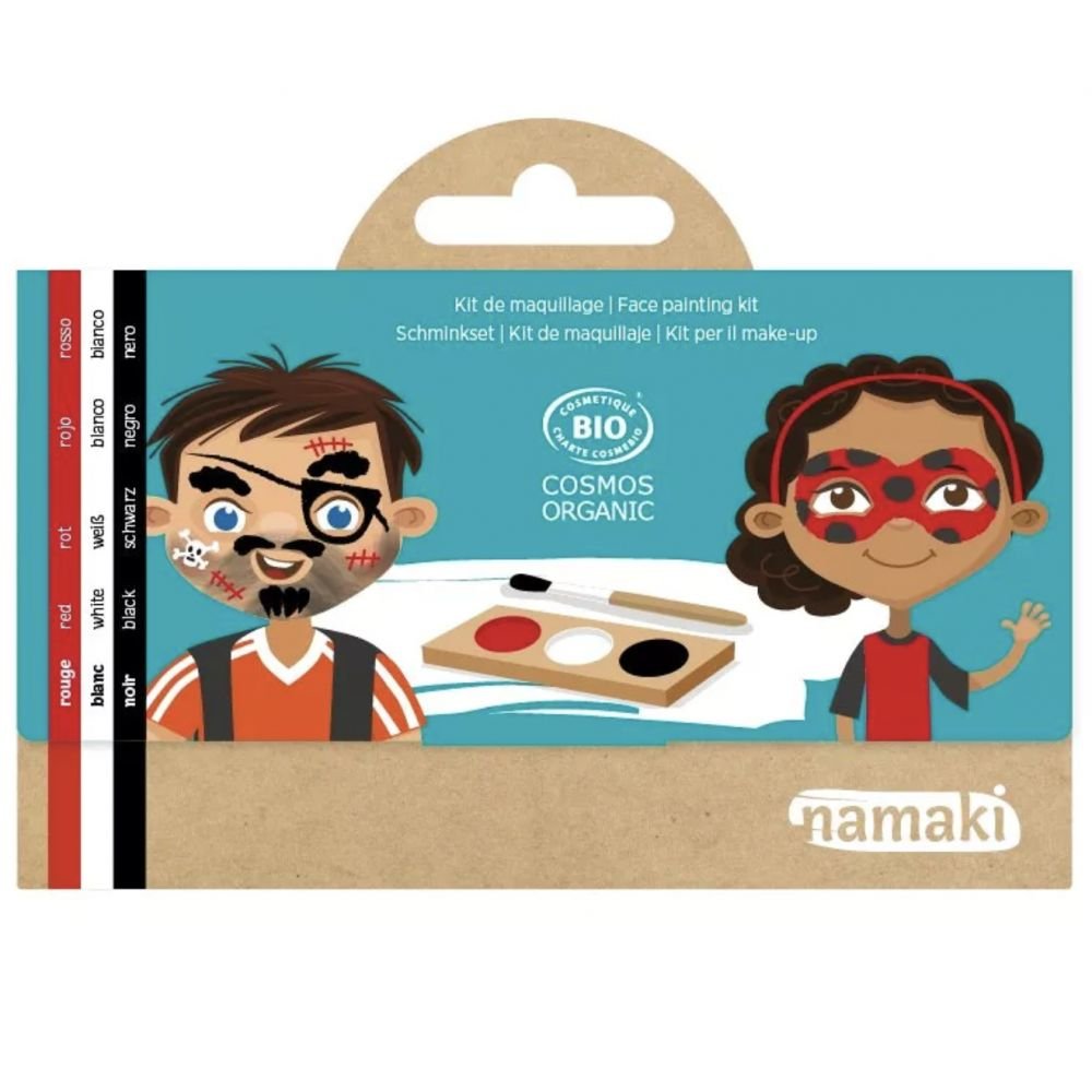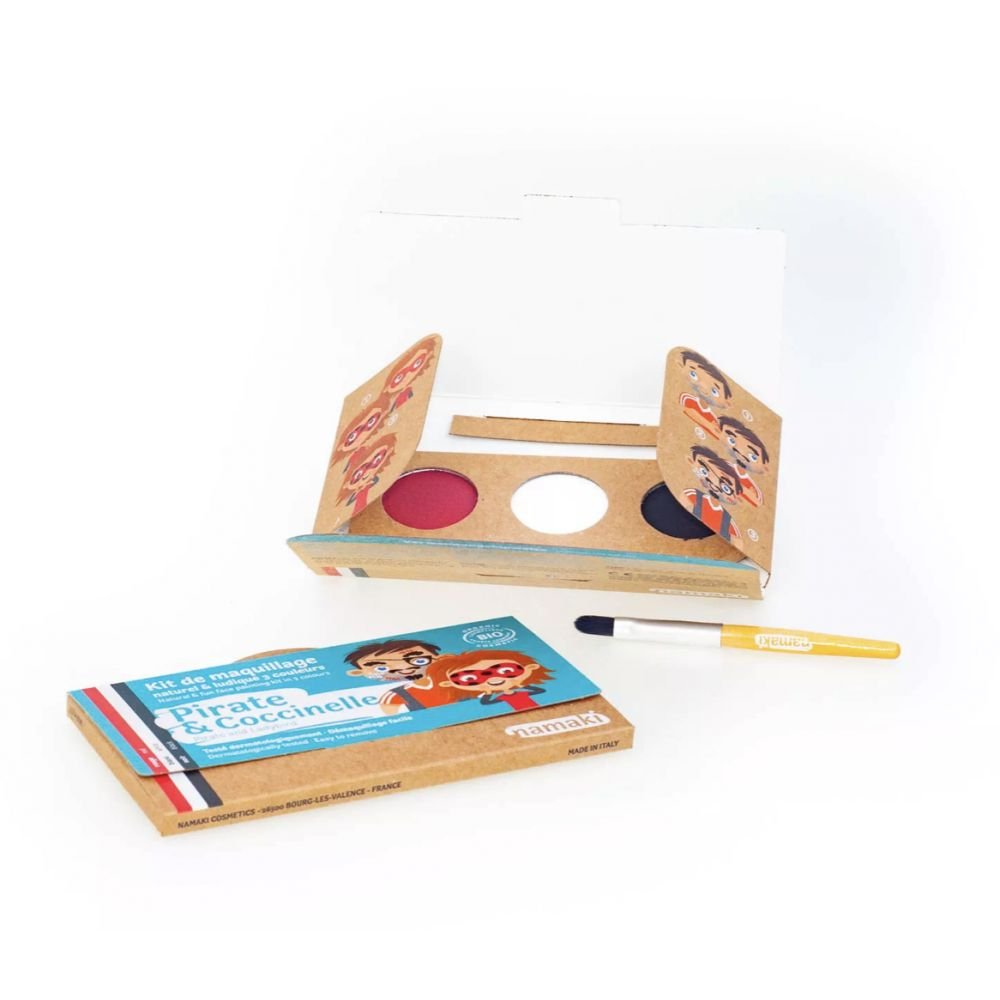 Transformez-vous en pirate ou en coccinelle avec ce kit de maquillage à l’eau certifié bio et hypoallergénique contenant une palette de 3 couleurs (rouge, blanc, noir), 2 modèles de maquillage et 1 pinceau.