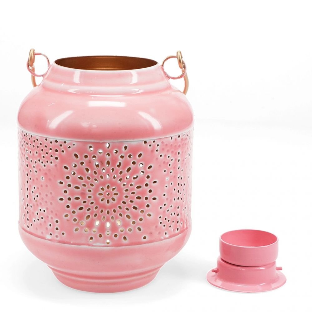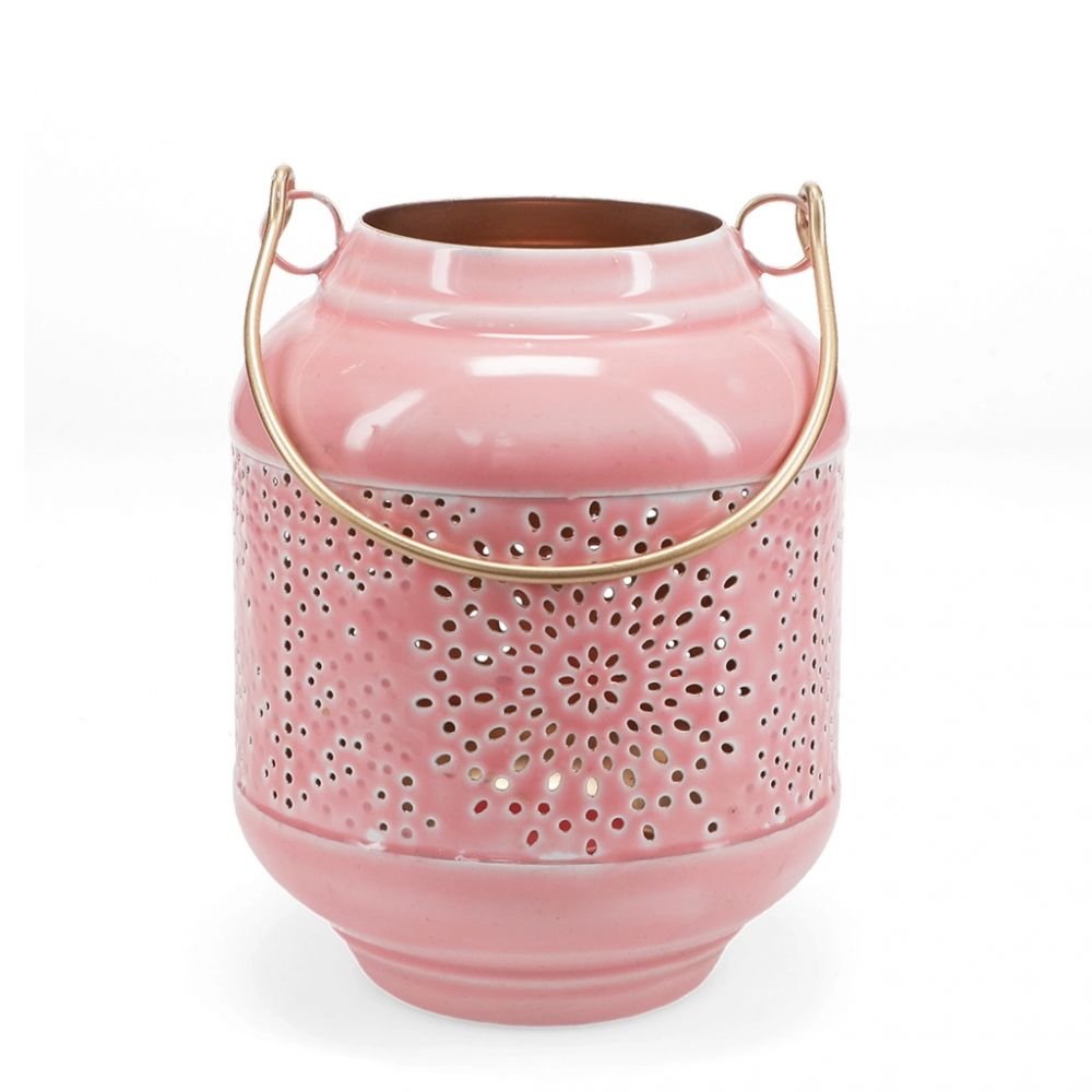 Lanternes décoratives en métal coulé pour bougies chauffe-plat, avec finition émaillée rose à l'extérieur, intérieur couleur laiton et poignée/boucle de suspension couleur laiton. Peut être suspendue ou placée sur une surface à l'intérieur ou dans le jardin. Le magnifique motif perforé illuminera l'espace avec de superbes motifs de lumière.