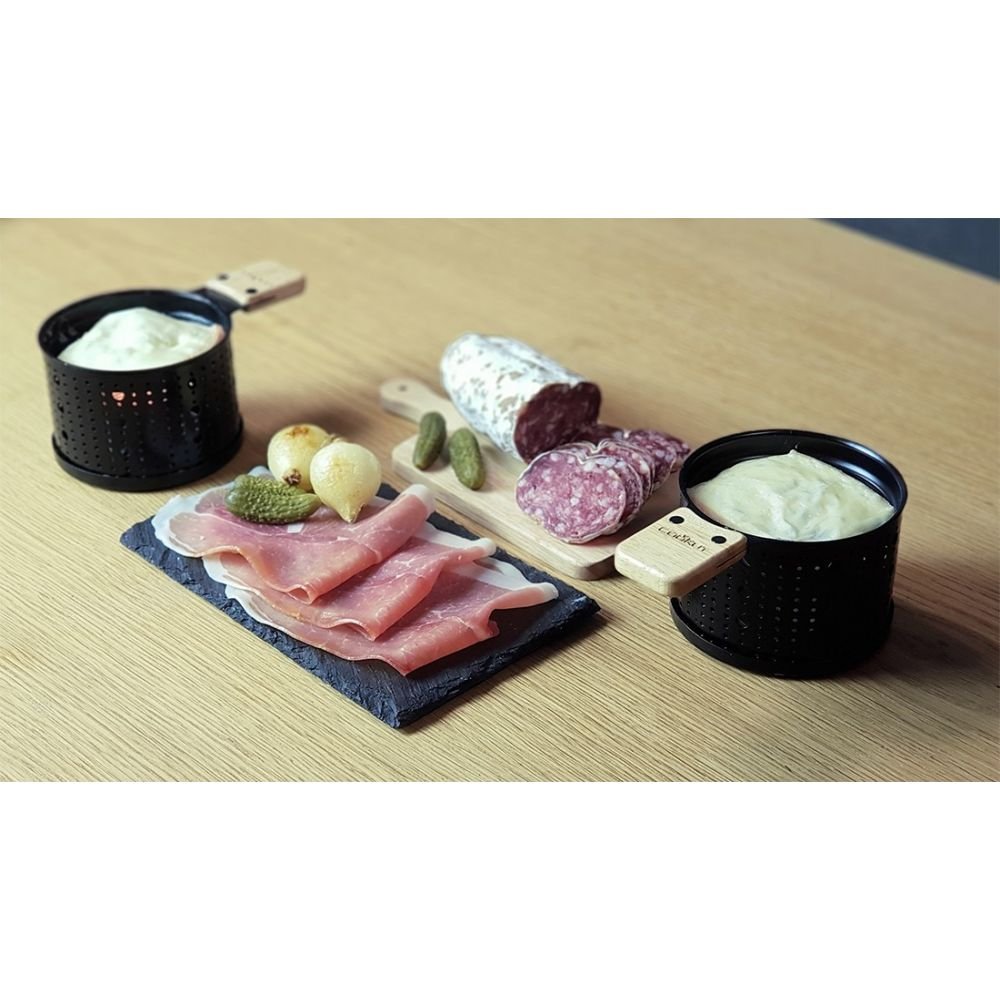 2 appareils raclettes à la bougie individuelles et 2 spatules en bois.