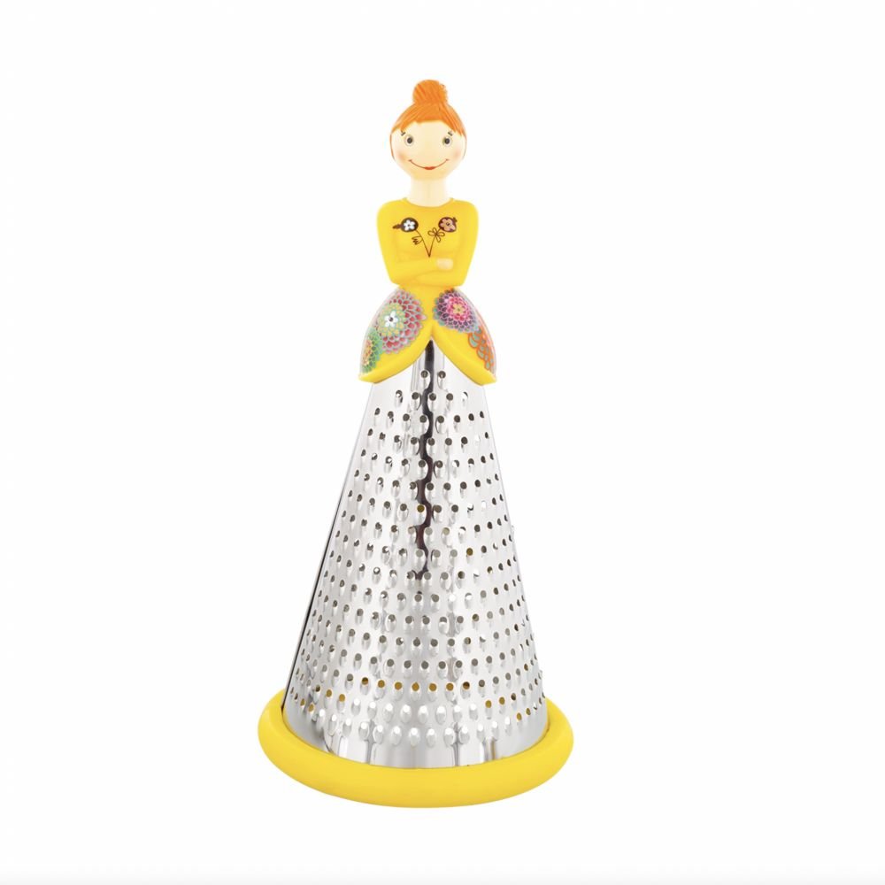 On m’appelle Ma Dame et on me complimente souvent pour mon côté chic et élégant. Parfois, on me dit que ma longue robe peut être râpeuse. Mais rassurez-vous, je suis espiègle et gourmande, et j’adorerais me glisser de votre étagère pour râper délicatement votre fromage, votre chocolat ou quelques zestes d’agrumes. Grâce aux trois tailles de trous présents sur ma robe, vous obtiendrez un râpage précis qui égaiera vos plats.