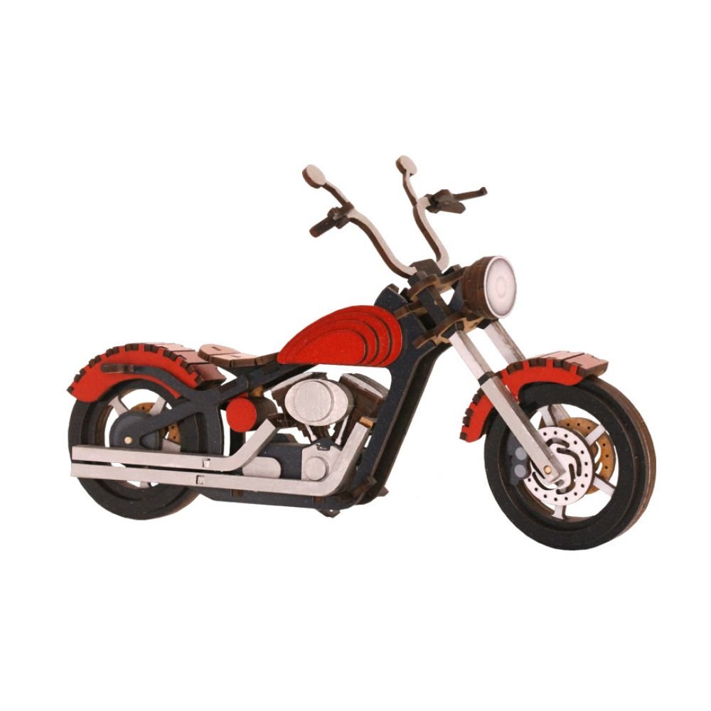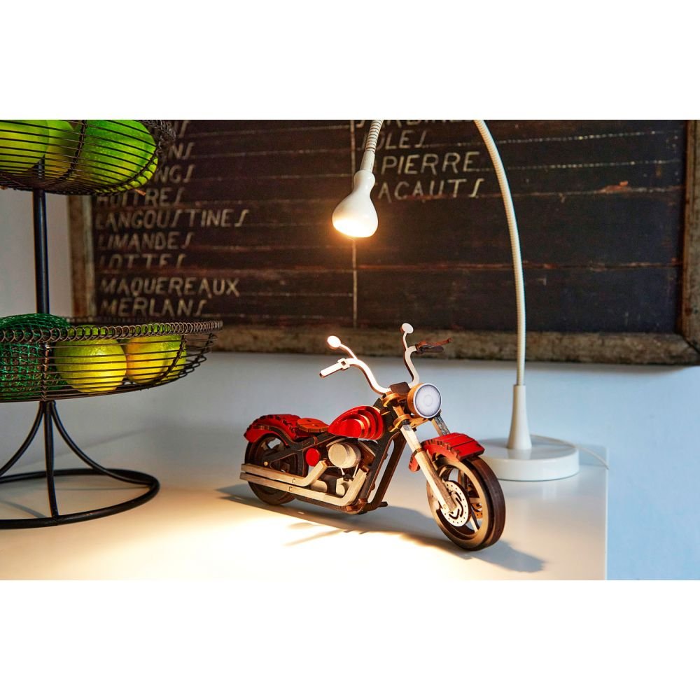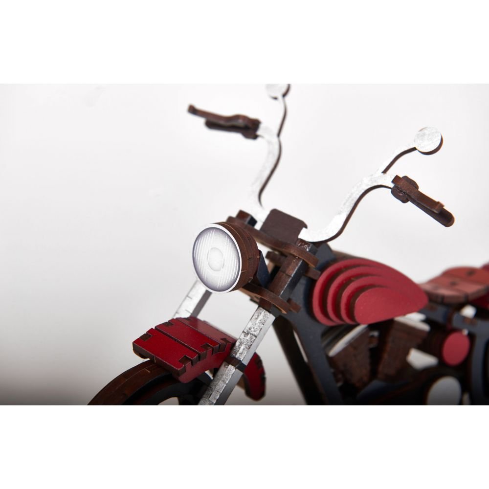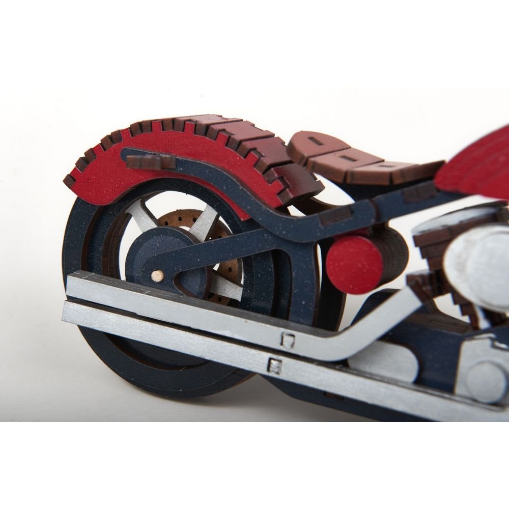 Facile à monter, cette bécane en bois viendra très bien orner un meuble ou une étagère.
