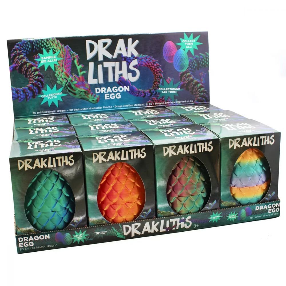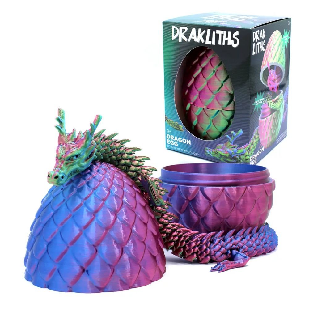 Les jouets anti-stress Drakliths présentent un œuf de dragon avec dragon mobile de 11 x 11 x 15 cm. Ces œufs de dragon imprimés en 3D sont détaillés et équipés de mécanismes qui rendent les dragons étonnamment réalistes. Chaque œuf contient un dragon, est présenté dans un emballage coloré, les dragons sont imprimés en 3D.