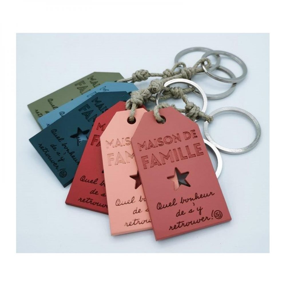 Porte clé avec inscription « MAISON DE FAMILLE quel bonheur de s’y retrouver ».
