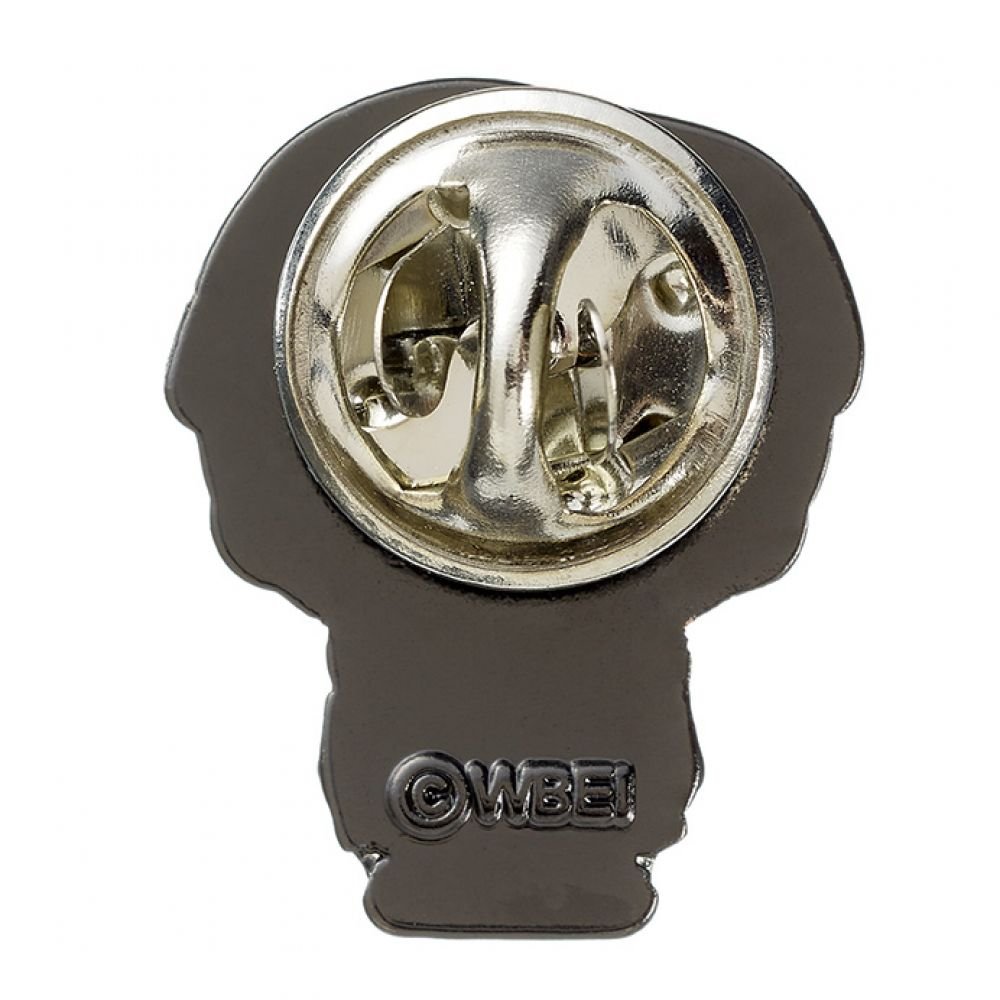 Ce badge à épingle est plaqué argent avec des détails en émail.