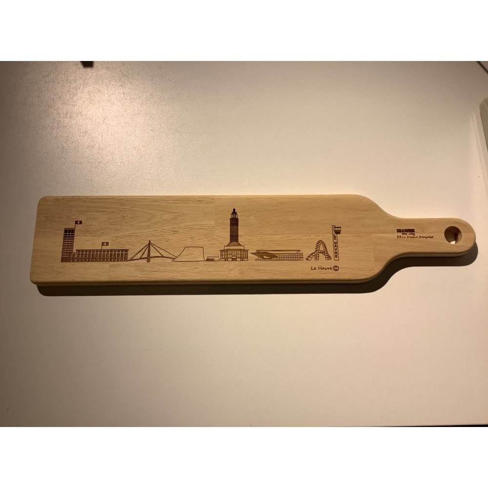 Dessin des monuments de la ville du Havre gravé sur une planche apéro en bois.