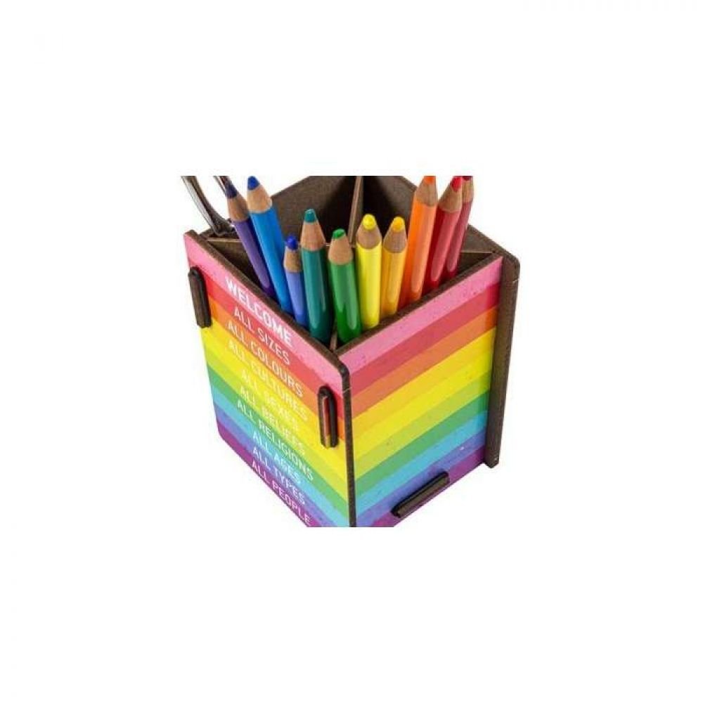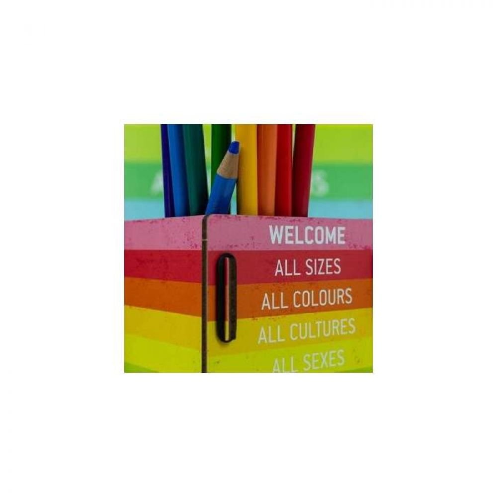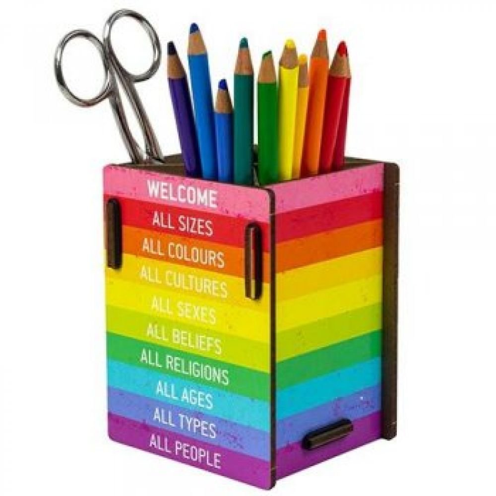 POT À CRAYONS AUX COULEURS DE L'ARC EN CIEL POUR UN MESSAGE FORT DE PAIX ET DE TOLÉRANCE.