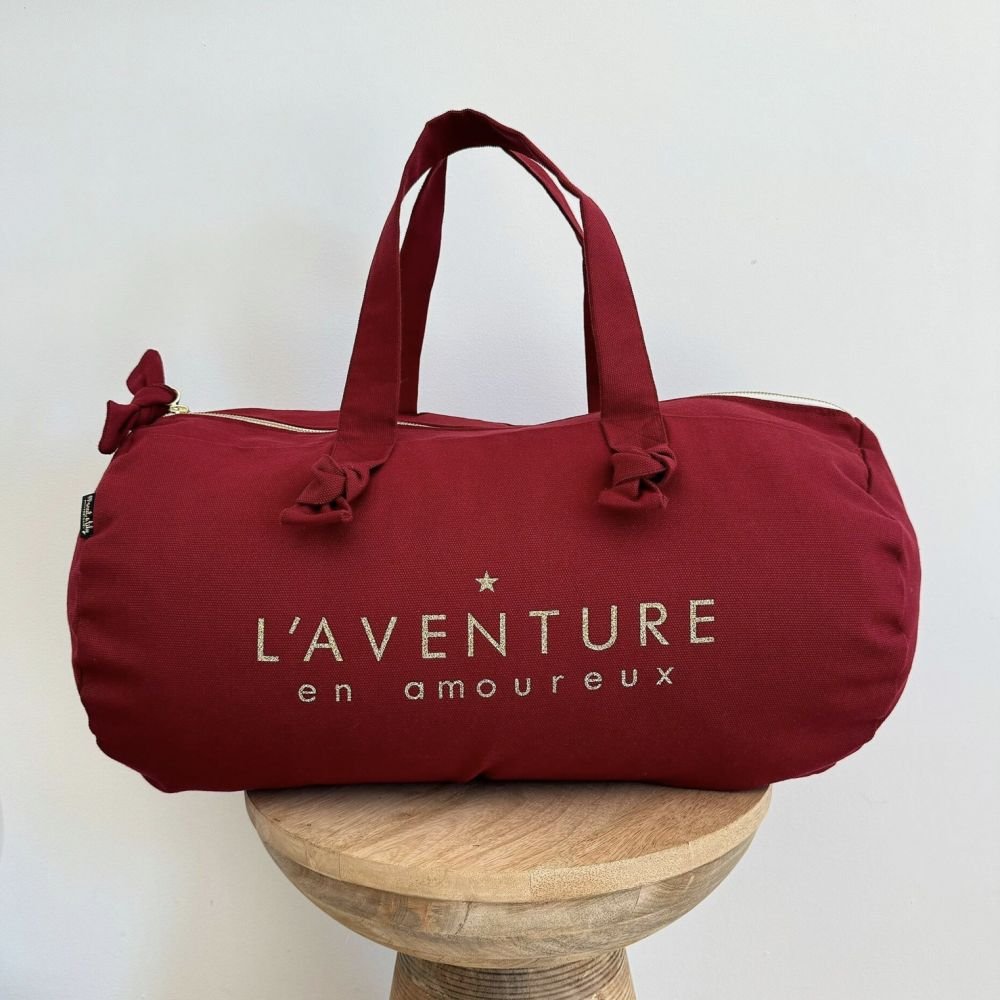 Sac polochon couleur bordeaux trop mignon pour les amoureux qui aiment partir à l'aventure .